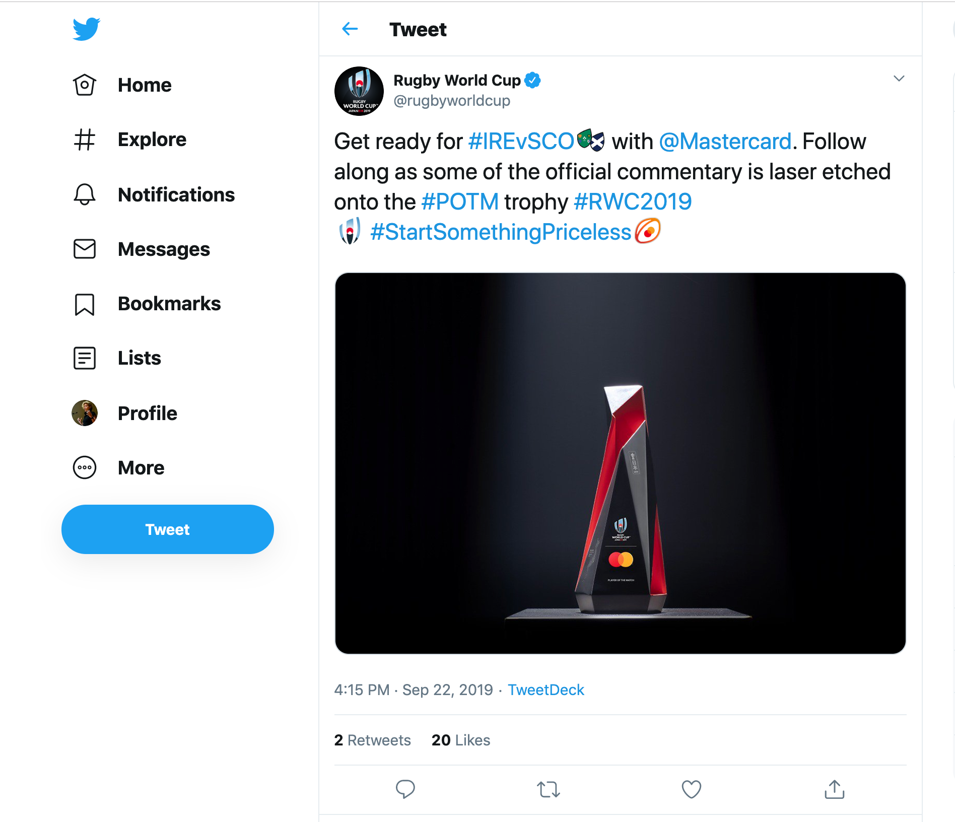 Monitoring fan activity on social media through a bespoke API, combined with commentary from the official world feed RWC 2019™, Mastercard can identify the top moments of each match to be immortalized on the trophy.
